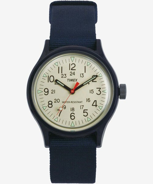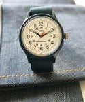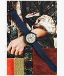 ミリタリーウォッチのオリジナルの良さを残しつつ、ミリタリー要素をもう少し和らげ、現代のスタイルに合わせやすい仕様となった、日本企画オリジナルキャンパーアイボリーシリーズ。ボーダーやデニムなど、ファッションに合わせやすい、ネイビーカラーが仲間入り。