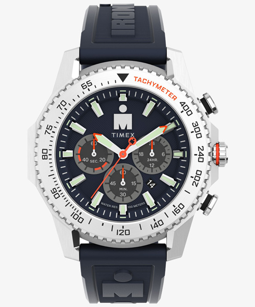 ラギッドな48mmサイズの<アイアンマン アドレナリン クロノグラフ>は、スポーツシーンでの使用感を念頭にしながら、カジュアルシーンでも目を引くディテールに富んだモデルです。 アイアンマンの伝統に倣い100m防水を維持し、タキメーター表示のベゼルとクロノグラフ機能とデイト表示を備えています。 12時位置にはアイアンマンのロゴマークが入る、アナログタイプは珍しいタイメックスのアイアンマン。