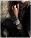 ダイヤルには、情熱的なレーシングストライプが走り、3時位置にはチェッカーフラッグをあしらった24時間表示のサブダイヤルを配置。まるでレースの勝利を告げる瞬間を腕元に刻むようなデザインです。