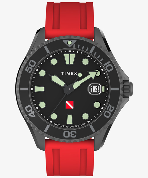 新作ティブロン オートマチックはアメリカ市場での「スペックの高いTIMEXが欲しい」という声に応えるべく開発されたモデルです。 男性的でいつの時代も人気のあるダイバーズウォッチ。実際に海で使うことのできるスペックと、デザインチームが細心の注意を払って設計した高級感あるルックスを兼ね備えています。 ダイバーが水面下にいることを示す赤字に白の斜線が入った"ダイバーダウンフラッグ"の意匠を文字盤に配し、手袋などをした手でも時計が脱着できるようデザインされたスリップスルースポーツクロージャを取り入れた赤いラバーストラップにも同じくフラッグマークが入っています。 耐衝撃性を備え耐腐食加工を施したステンレススチール製ケースに回転式セラミックベゼルを合わせ、サファイアクリスタル風防、内部は日本製の機械式ムーブメントを搭載ねじ込み式リューズとケースバックという仕様で200M防水を実現しています。このほか時分秒針とインデックスにはスパールミノバを採用、一般的なTIMEXと使用している素材のクオリティをあげることでより実際的、本格的なシーンでの利用を可能にしています。