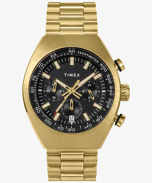 TIMEXでは新たにこのトノーシェイプをリバイバルしアップデート。立体的なアプライドのインデックスや6時位置の日付窓、インナーベゼルにタキメーター表記を設けるなど、往年の名デザインをベースにしながらモダンに仕上げています。