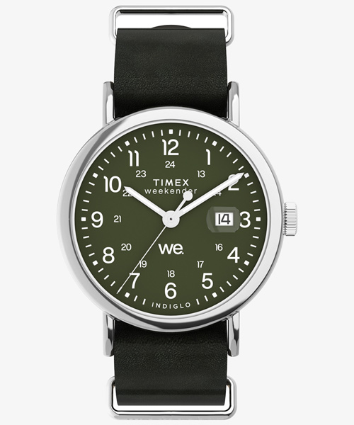 カジュアルに使える評判で、発売から10年以上を経たいまでもトップセラーのひとつ<ウィークエンダー>。性別や年齢を問わず似合ってしまうサイズ感と汎用性の高いデザイン、珍しい真鍮をケース素材につかうことで程よく重量感があり、暗所で文字盤が光るインディグロ®ナイトライトを搭載している点も人気の理由です。 その<ウィークエンダー>がリニューアルし、初めてモデル名が文字盤に入り、3時位置には拡大窓の付いたデイト表示が加わり利便性が増しました。定番的な人気の40mmサイズ、中でもネイビー x ブラウンの組み合わせがニューモデルでもラインナップ。さらに環境に優しいプロセスで作られたサステナブルレザーをストラップ素材に採用。 発売当初から伝統の創業地が真鍮加工で栄えた歴史から真鍮製ケースを維持し、見やすいダイアルデザインはフォントを刷新。そしてタイメックスの代名詞的機能でもあるインディグロ®ナイトライトも当然継承しています。 シンプルがゆえに誤魔化しのきかない定番アイテムこそ、ブランドの真価が問われる。新しい<ウィークエンダー>、ぜひお試しください。