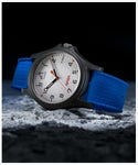 人類を月面に送り込み月面探査するというNASAの壮大なプログラム「アルテミス計画」の名を冠したコラボレーションウォッチ。 航空機を思わせるホワイトを文字盤に採用、そこにアイコニックな赤いNASAのロゴが入っています。12時位置にはアルテミス計画のシンボルマークが配され、このミッションの理念を力強く表現しています。 軽量なレジン製のレジンケースに宇宙飛行士のフライトスーツを想起させるネイビーのシリコンストラップを合わせ、機能性と冒険心をくすぐる魅力を兼ね備えています。