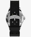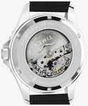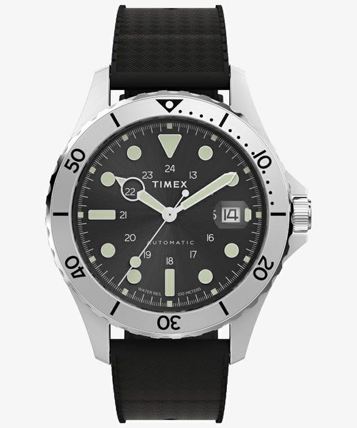 力強く、そして洗練されたデザインを兼ね備えた自動巻きモデルにニューカラーが登場。 41mmのステンレススチールケースにはリューズガードと、経過時間の計測に使える回転式ベゼルを装備。 裏蓋は日本製自動巻きムーブメントが動く様子を眺められるシースルー仕様。 丁寧なサンレイ仕上げの文字盤に拡大窓付の日付表示、蓄光針とインデックス、24時間表示のアラビア数字インデックスを配置しています。 軽量で柔軟性のあるレジン製ストラップは通気性を高めるパーフォレーションを施し長時間の着用も快適です。