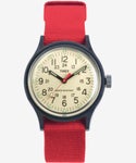 ミリタリーウォッチのオリジナルの良さを残しつつ、ミリタリー要素をもう少し和らげ、現代のスタイルに合わせやすい仕様となった、日本企画オリジナルキャンパーアイボリーシリーズ。レッドストラップxネイビーケース の組み合わせは、手元に存在感を与えてくれるカラーリング。本モデルは、1990年にオリジナルのキャンパーの後継として四半世紀に渡り販売され、惜しまれつつも最近メーカー廃番となった34mm径キャンパー(T18581/T41711)をベースにしたアイボリーダイアルを、新たに同じく日本企画の「オリジナルキャンパー」で再現したニューモデル。以前に販売されていた34mm径のアイボリーキャンパーは、女性誌スタイリストや編集者にも支持を広げ、それまでの主要ファン層であった男性ユーザー以外に多くの女性ユーザーも獲得。結果売上本数が1万本をゆうに超える人気商品となり、再販の声が高い中、今回よりオリジナルに近い形で再リリースとなった。