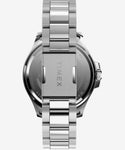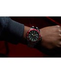 ワインレッドとゴールドの回転式ベゼル、ブラック文字盤のカラーリングが印象的なモデルです。 ベンツ針やデイト機能の他100m防水など、視認性と実用性を兼ね備えながら、リューズガードを設けた43mm径のあるシルバートーンのケースに、ステンレススチール製のブレスレットの組み合わせでオンオフ万能な一本です。 無骨かつ利便性がありどこかアメリカ時計らしさを感じるこちらのモデルは日本国内公式オンライン限定になります。