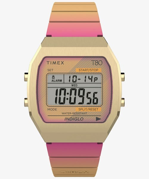 色には気分に直接影響を与える力があり、T80の最新モデルはポジティブさと楽しさを感じさせるカラーリングに包まれています。 カレンダー機能、ストップウォッチ、液晶面が光るインディグロ®ナイトライト、30メートル防水、アラームなど日々の生活に便利な機能を搭載。モダンでなめらかなシルエットのステンレススチール製ケースに、きれいなグラデーション加工された樹脂ストラップの組み合わせもポイントです。 鮮やかなデザインはどんなスタイルに合わせてもポジティブなエネルギーをもたらします。