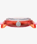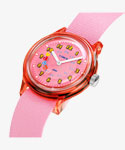 パックマンとゴーストがクルクル回転するディスクが秒針の代わりをはたし、人気キャラクターのインキーのブルーを軽量な半透明の36mm径樹脂製ケースで表現しています。ミリタリーウォッチ由来の長さ調整が可能なナイロンストラップも同系色のライトブルーになっています。