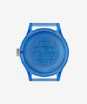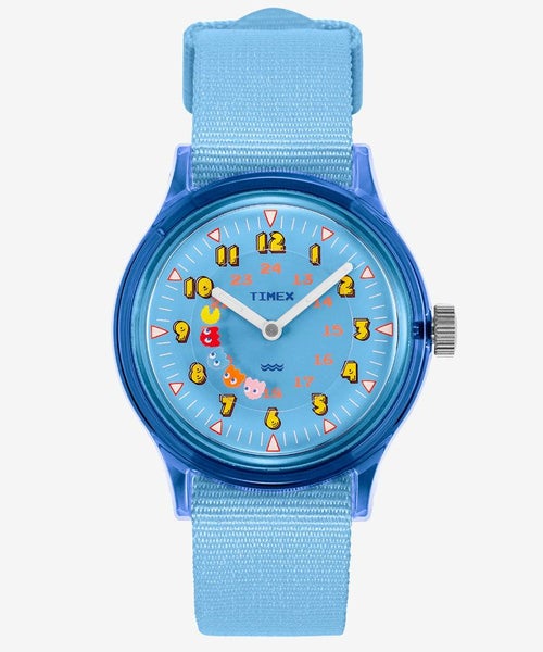 日本が生んだ世界的ゲーム&人気キャラクター「パックマン」とタイメックスのコラボレーション第3弾。タイメックスの不朽の名作オリジナル・キャンパーをベースに、ロゴや数字などすべてがパックマン仕様のスペシャル限定モデルです。パックマンとゴーストがクルクル回転するディスクが秒針の代わりをはたし、人気キャラクターのインキーのブルーを軽量な半透明の36mm径樹脂製ケースで表現しています。ミリタリーウォッチ由来の長さ調整が可能なナイロンストラップも同系色のライトブルーになっています。パッケージはドイツのぬいぐるみメーカー「NICI(ニキ)」とのトリプルコラボレーション!パックマンに登場するゴーストの形をあしらった、手触りの良いぬいぐるみポーチにウォッチが入っています。ポーチには小物などを入れられるほか、カラビナが付いているのでバッグなどにも付けられます。