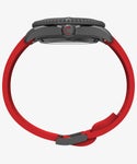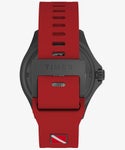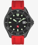 新作ティブロン オートマチックはアメリカ市場での「スペックの高いTIMEXが欲しい」という声に応えるべく開発されたモデルです。 男性的でいつの時代も人気のあるダイバーズウォッチ。実際に海で使うことのできるスペックと、デザインチームが細心の注意を払って設計した高級感あるルックスを兼ね備えています。 ダイバーが水面下にいることを示す赤字に白の斜線が入った"ダイバーダウンフラッグ"の意匠を文字盤に配し、手袋などをした手でも時計が脱着できるようデザインされたスリップスルースポーツクロージャを取り入れた赤いラバーストラップにも同じくフラッグマークが入っています。 耐衝撃性を備え耐腐食加工を施したステンレススチール製ケースに回転式セラミックベゼルを合わせ、サファイアクリスタル風防、内部は日本製の機械式ムーブメントを搭載ねじ込み式リューズとケースバックという仕様で200M防水を実現しています。このほか時分秒針とインデックスにはスパールミノバを採用、一般的なTIMEXと使用している素材のクオリティをあげることでより実際的、本格的なシーンでの利用を可能にしています。