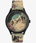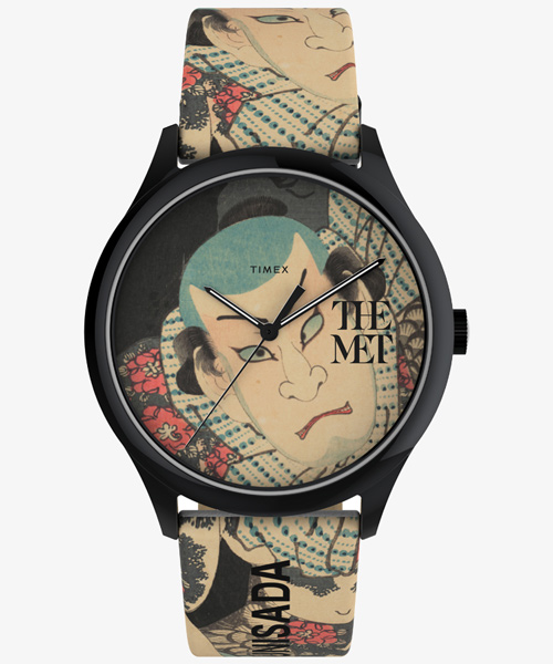アメリカ・ニューヨークにあるメトロポリタン美術館、通称The MET。こちらはそこに所蔵されている江戸時代に活躍した浮世絵師、歌川国貞の代表作のひとつを大胆に時計に取り入れたコラボレーションモデルです。 中国の武勇伝、水滸伝をベースにした歌舞伎にでてくる「朝比奈藤兵衛」を演じた人気役者がモチーフで、奇しくもこの作品が世に出たのはタイメックスの創業年と同じく1854年でした。 作品の図柄はストラップ部分にまで入り、艶やかなステンレス製ケースがフレームの役割を果たすかのように良いコントラストを生んでいます。 世界を代表するメトロポリタン美術館に所蔵されるアート作品を腕にまとう、という新しいアプローチをお楽しみください。