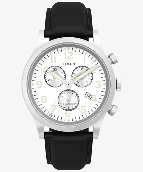 タイメックスの前身であるWaterbury Clock Companyは1854年に創業、以来170年以上という長きにわたり時計を作り続けています。 古びることのない、いわば王道的なデザインは、派手さこそないもののいつの時代も安心して着けることができる秀逸さを持ち合わせています。 この<ウォーターベリー トラディショナル クロノグラフ>もその好例で、ステンレススチール製の造形が美しいケースに洗練されたデザインの見やすいダイアル。 自社のヘリテージを、さり気なく7時位置に配したWaterbury Clock Companyのロゴと、秒針の根元にあしらわれたWで象っています。