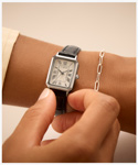 21mmの小振りな長方形に、光を捉えるポリッシュ仕上げのケースが特徴の華やかなドレスウォッチ。
