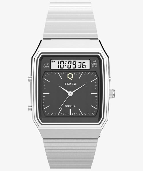 細身の針、ポリッシュ仕上げのクラウンとプッシャー、ブラッシュ仕上げのシルバートーンまたはゴールドトーンのステンレススチールブレスレット、そしてオリジナルモデルを受け継ぐ「Q TIMEX」のロゴが、このアナデジドレスウォッチを特別な一本に仕上げています。まさに往年の名作が復活を遂げたユニークなモデルです。