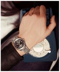 ブラッシュ&ポリッシュの2タイプの仕上げを組み合わせたケースが光と反射のダイナミックなコントラストを生み出し、ちょっとレトロでありながら今っぽさのあるデザインを取り入れています。