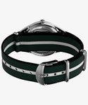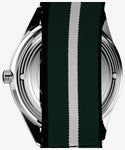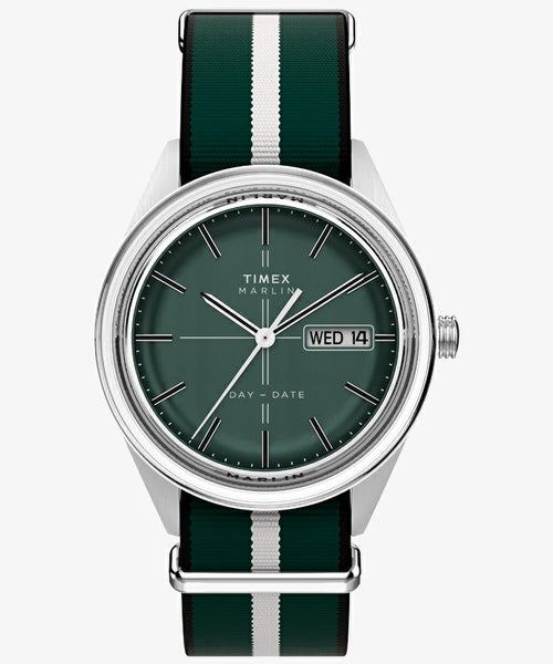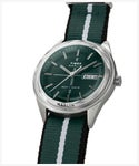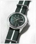 少し未来感が漂うベゼルがなくミドルケースまでをドーム風防が包み込んだ、<マーリンジェット>に、新たにクォーツモデルが初登場。 立体的なダイヤルデザインに、アプライドのバーインデックス、スリムな針、そして12時と6時位置に小さくロゴが入り、モデル名は6時側のドーム風防に覆われたベゼル部分に入っています。 マットなグリーンの文字盤の3時位置にはデイト表示が配置され、50m防水で日常使いには申し分ないスペック。 リサイクル素材を使用したリボンタイプのストラップを組み合わせ、クリーンなデザインにカジュアルな要素をプラスしています。