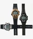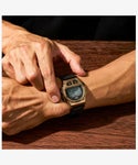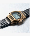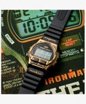 名作多しといえども、時計史においてもエポックのひとつと呼ばれるのが、この<アイアンマン® 8ラップ>。それまで真っ黒が主流だったデジタルウォッチのステレオタイプを打ち破り、さらにはフロントボタンを設けて8ラップのメモリー機能を搭載しながら100m防水を実現。 アメリカ大統領が着用した話や、アイアンマン®シリーズの時計がNASAの宇宙飛行士が実際に宇宙で着けた話、マイクロソフト社との共同開発モデルのベースになったなど語れる逸話には枚挙にいとまがありません。これは日本企画として実現した1986年のオリジナルモデルの復刻をきっかけに、当時のデザイナーやタイメックス本社内での間で交わされた会話から生まれた、メタル仕様の<アイアンマン® 8ラップ>。 名作のデザインや操作性を維持しながら、ケース、トップリングやプッシャー類をすべてステンレススチール製にアップグレード。防水性を保証するため、ケースやパーツの金型を一から作り直し、裏蓋の構造もこのモデルのために刷新しました。自社工場仕上げの燻したようなゴールドトーンのケースは品のあるカラーが特徴です。