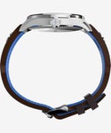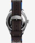 かつて世界にその名を馳せたパンアメリカン航空、通称パンナム航空とのコラボモデル。同社は1930年代から1980年代にかけて名実ともにアメリカのフラッグ・キャリアとして広範の路線網を展開し、ビートルズやケネディ等多くのセレブリティを運びました。視認性の高いインデックス、無反射コーティング、円錐型のリューズ、蓄光針を備えたパイロットウォッチ仕様。レザーストラップにはアクセントの“グローブ”ロゴが配されています。パッケージはPan Amカラーのブルーを基調とし、レトロなステッカー風なデザイン。パイロットが着けるようなピンバッジも付属します。