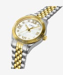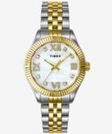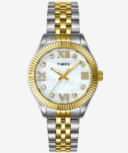 TIMEXの創業地、コネチカット州ウォーターベリーの名を冠した、時計ブランドとしての王道を行く、鉄板なデザインが魅力の“ウォーターベリー”コレクション。“ウォーターベリー”コレクションからウォーターベリー社設立当初にタイムピースを製作した女性たちに敬意を表したモデル『ウーマンズ ウォーターベリー レガシー』が登場します。文字盤にはマザーオブパールを採用し光の当たり具合で七色に輝き、様々な表情を楽しめます。大き目のクリスタルインデックス、ローマ数字がアクセントになっています。