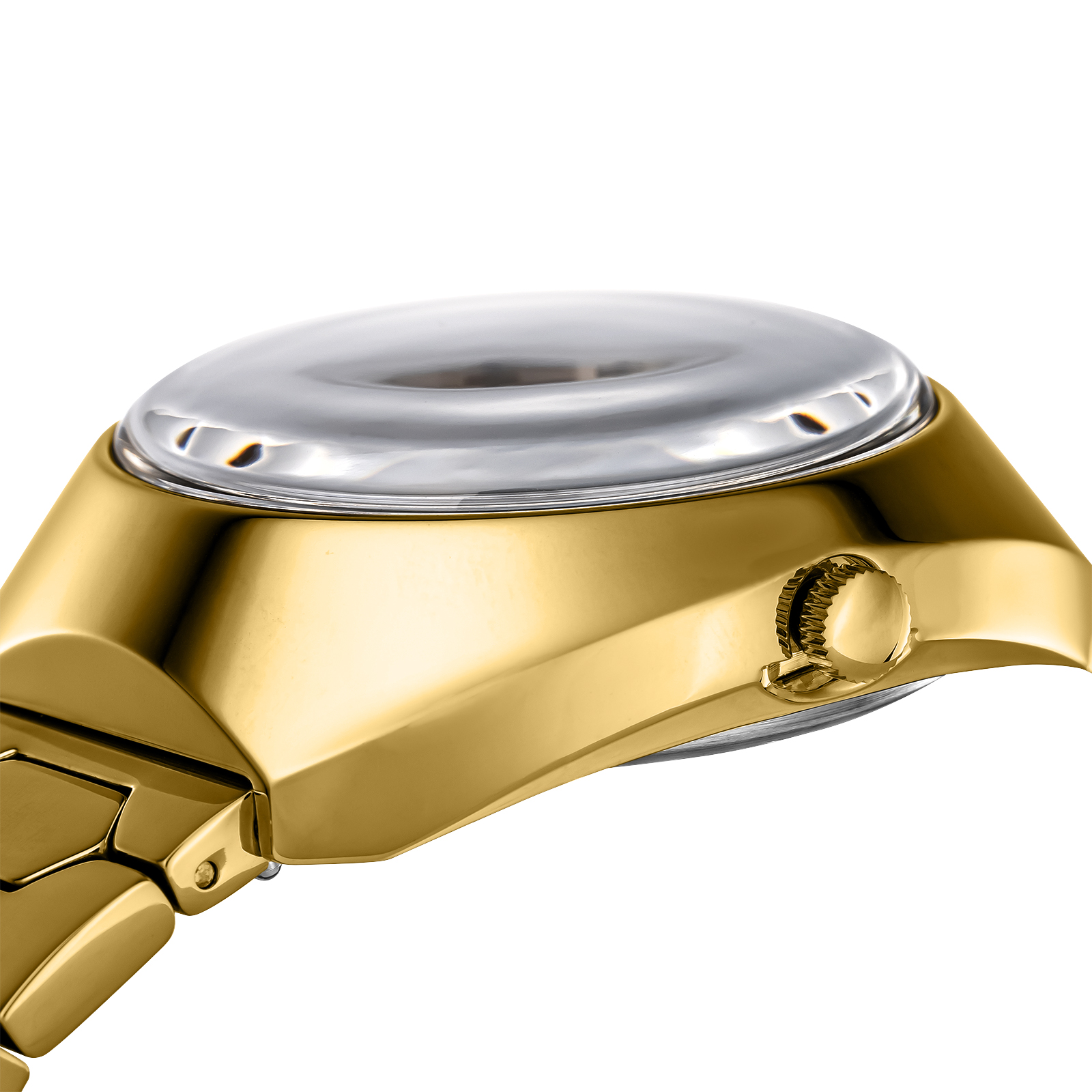 39mmのぷっくりとしたトノー型ケースは、全面ポリッシュ仕上げによる美しい輝きを放ちます。