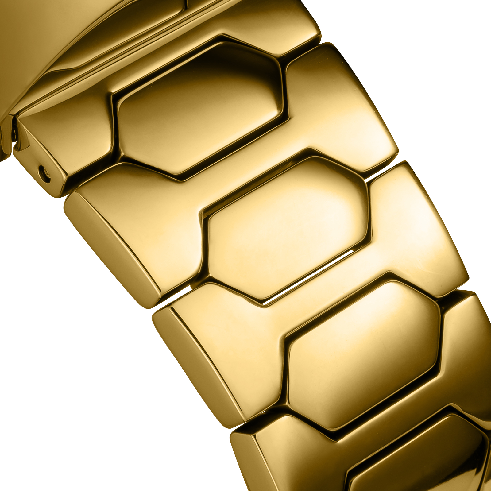 幾何学的なリンクブレスレットは肌なじみが良く、レトロな魅力にモダンなエッジをプラス。タイムレスな仕上がりです。